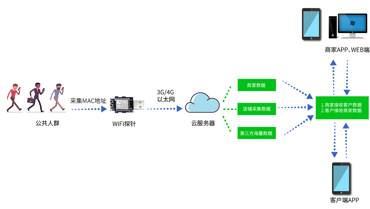 2探针通过已有的营销设备将数据上传到服务器后台与其他的营销数据进行打通融合,如支付数据、CRM系统中的顾客信息、顾客的线上信息等。