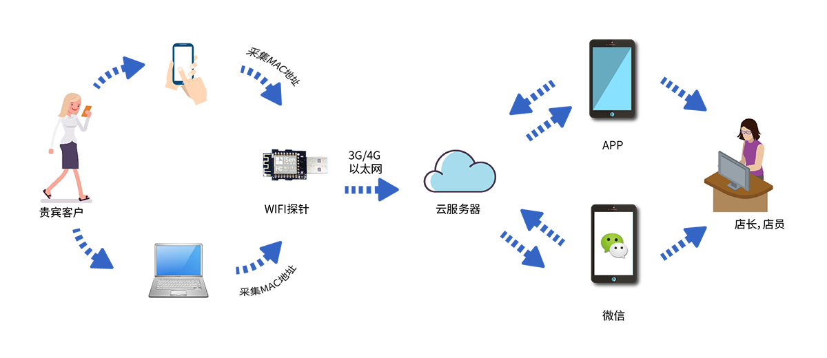 1将探针设备安装在需要重点关注VIP/重要人员是否出现的区域,如前台,会客室等,探针通过USB供电、通过网络上网。探针将采集到的MAC地址通过网络实时上传到服务器后台;